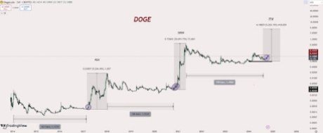 From 2017 to 2018, the analyst disclosed that the price of Dogecoin had skyrocketed by 9,226.49%. After experiencing a bear market and a prolonged period of price fluctuations, the meme coin witnessed another massive surge between 2020 and 2021. At the time, Dogecoin had recorded a whopping 30,693.75% price increase, leading to its current all-time high of $0.74.