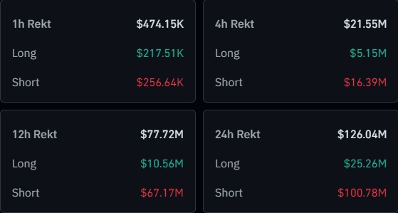 It would appear that the cryptocurrency derivatives market has registered total liquidations of $126 million in the past day. Out of these, almost $101 million of the contracts were short ones.