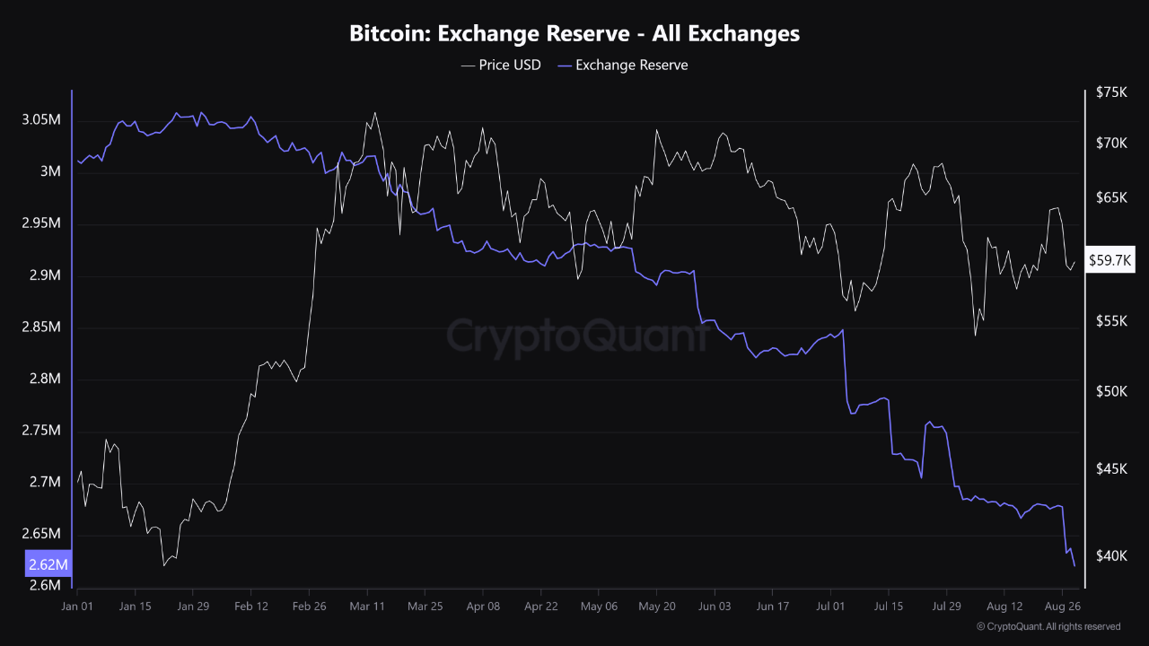 Now, here is a chart that shows the trend in the Bitcoin Exchange Reserve since the start of the year 2024:
