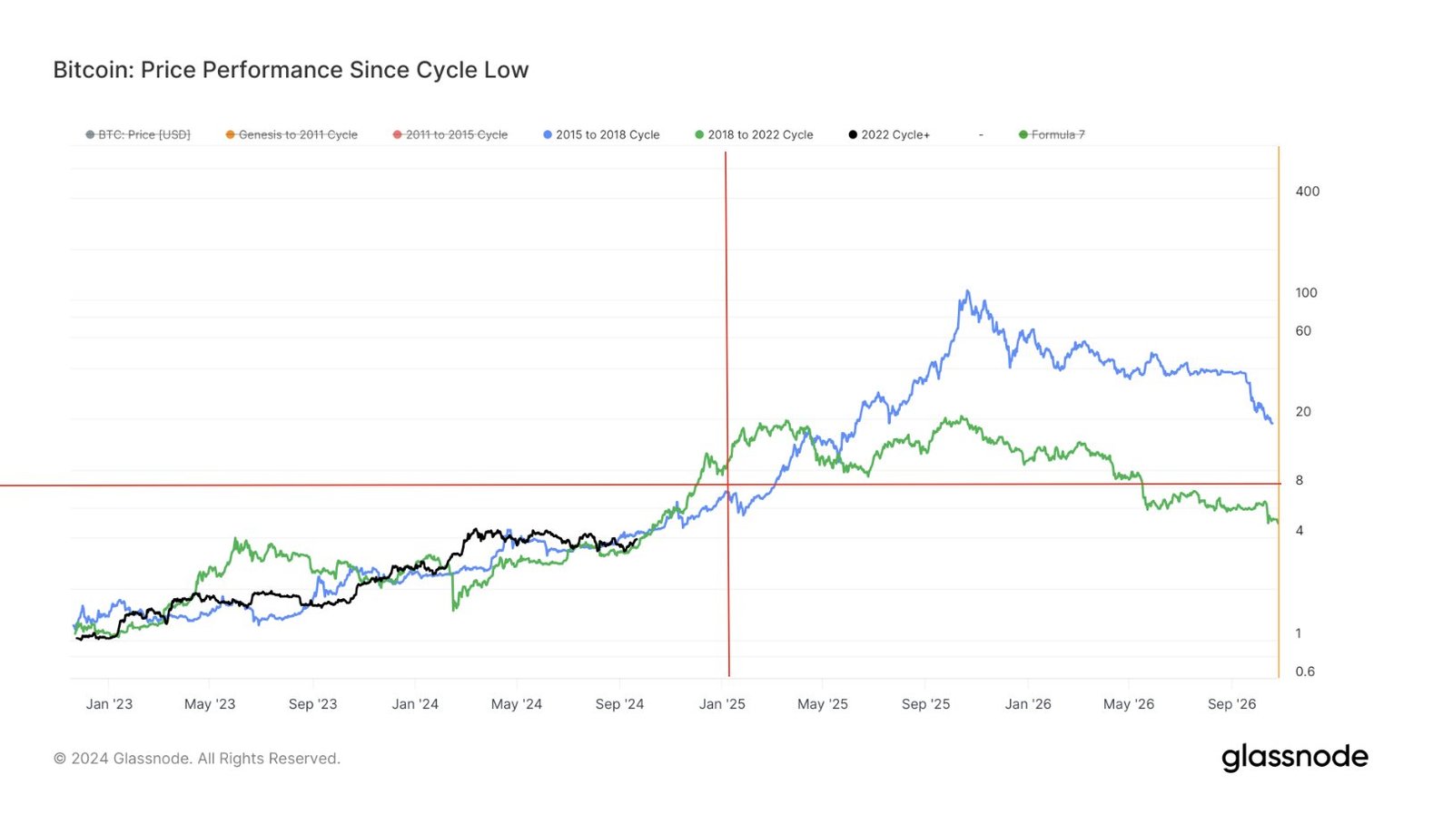 As is visible, the asset’s recent price performance has been remarkably similar to that witnessed in the past two cycles at the same stage. “Out of all the graphs, TA etc, Bitcoin from the cycle low continues to be the most valid,” notes the analyst. Given the similarity so far, it’s possible that the coin’s trajectory in the current cycle may continue to mimic that of the last two.