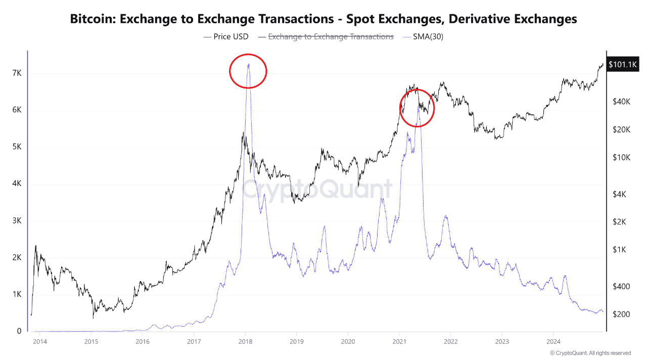 According to Woominkyu, historical data suggests a correlation between transaction volume spikes and significant price movements. For example, peaks in exchange transactions coincided with Bitcoin’s dramatic price surges in 2017 and 2021.