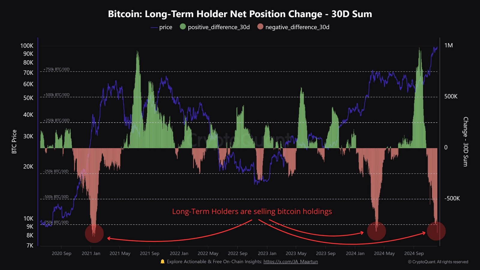 As CryptoQuant community analyst Maartunn explained in a new post on X, the long-term holders have sold big in the past month. The “long-term holders” (LTHs) refer to the Bitcoin investors who have been holding onto their coins for more than 155 days.
