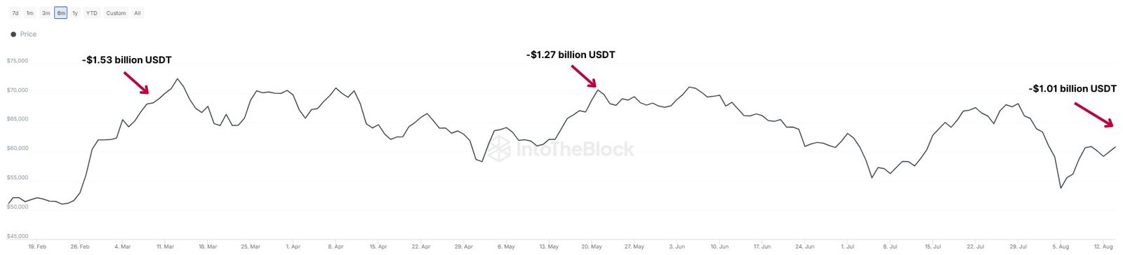 As IntoTheBlock has pointed out in the chart, the last two large USDT exchange outflows also had a bearish effect on BTC.