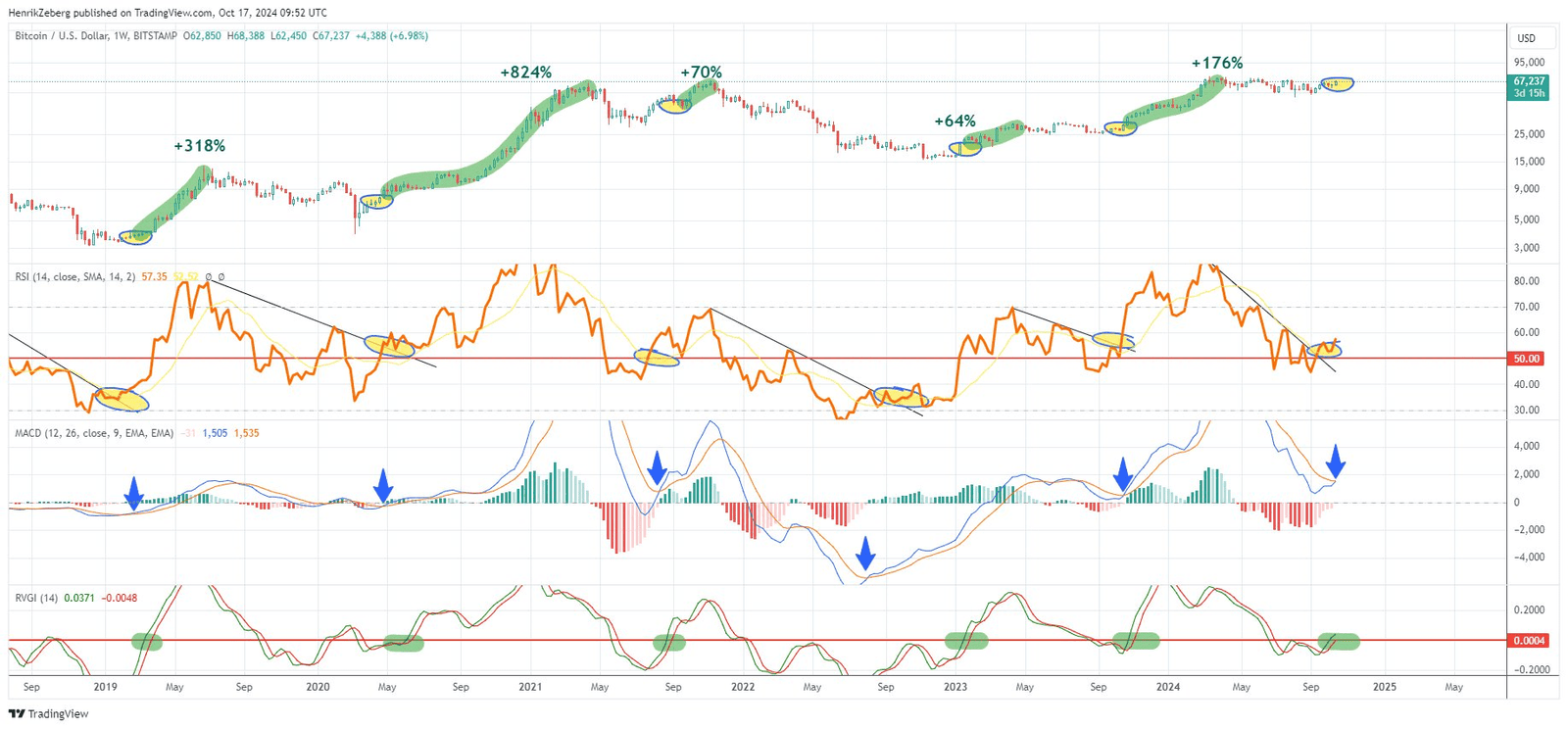 The chart provided by Zeberg is annotated with several instances where these conditions were met in the past, each followed by significant price rallies. These include surges of +318% in 2019, +824% in 2020, +70% in late 2021, +64% in January 2023, and +176% in the second half of 2023, indicating not just minor increases but substantial bull runs. The historical context adds weight to the current setup, suggesting that a similar outcome may be on the horizon.