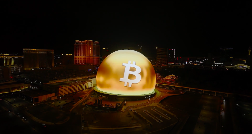 The Sphere displayed a video with a massive Bitcoin logo taking over the Las Vegas Strip before turning into rotating golden coins with the BTC logo. As a result, the flagship cryptocurrency became the first ever crypto to be showcased on the Sphere’s screens.