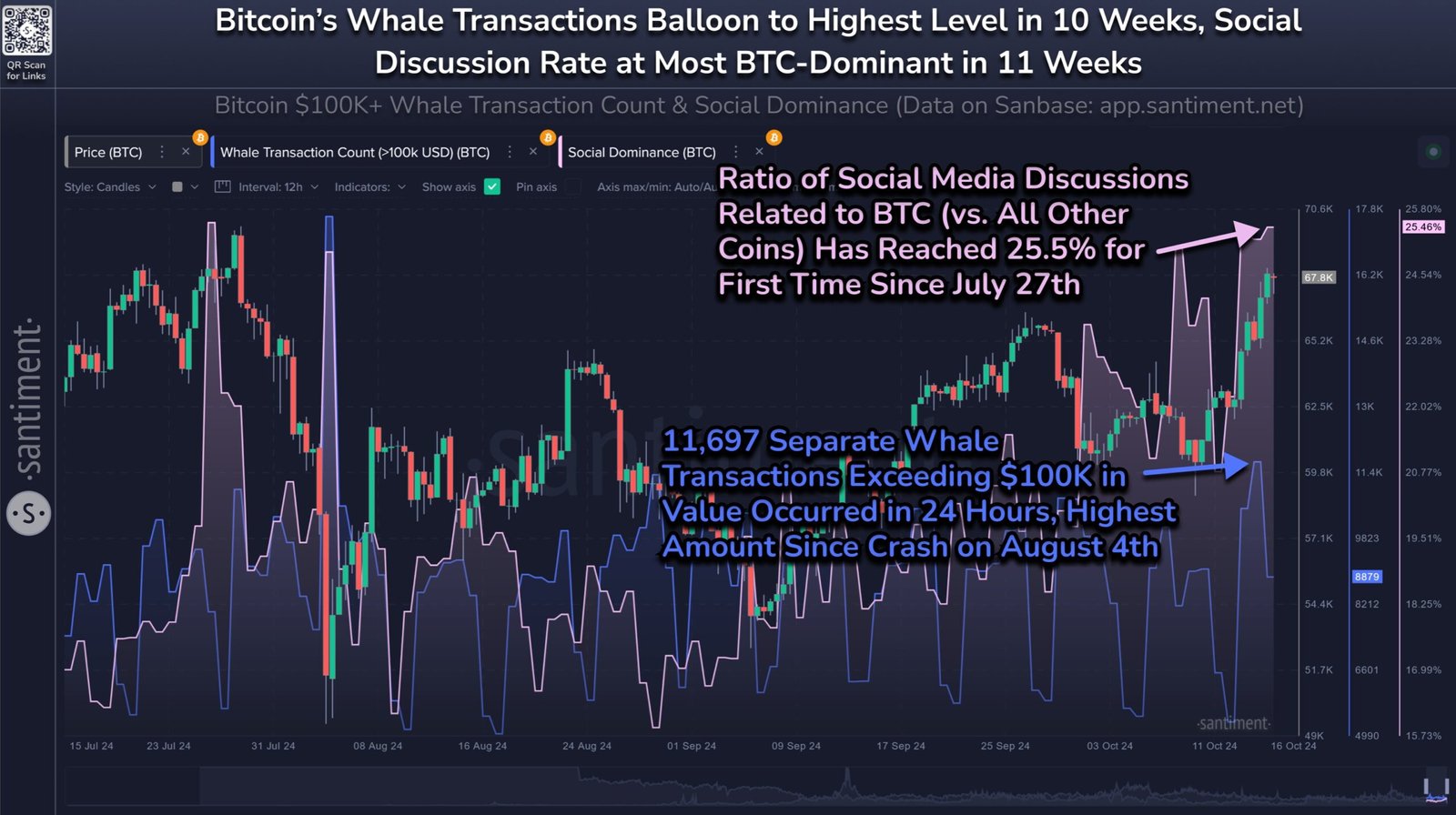 According to data from the on-chain analytics firm Santiment, the Bitcoin whales have shown an increase in activity recently. The indicator of relevance here is the “Whale Transaction Count,” which keeps track of the total amount of transfers taking place on the BTC blockchain that are carrying a value of at least $100,000.