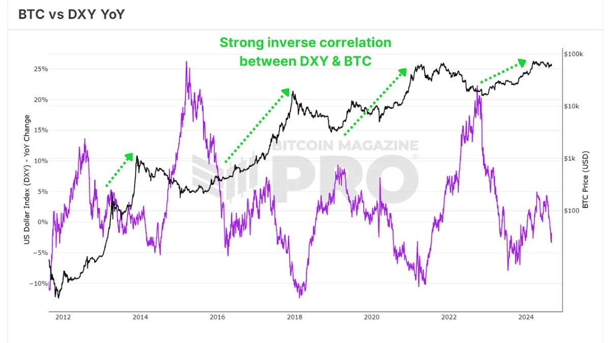 The Dollar Strength Index (DXY) measures the value of the U.S. dollar against a basket of other major global currencies. Historically, a declining DXY has often coincided with significant rallies in Bitcoin’s price. Conversely, when the DXY is on the rise, Bitcoin tends to enter a bearish phase.