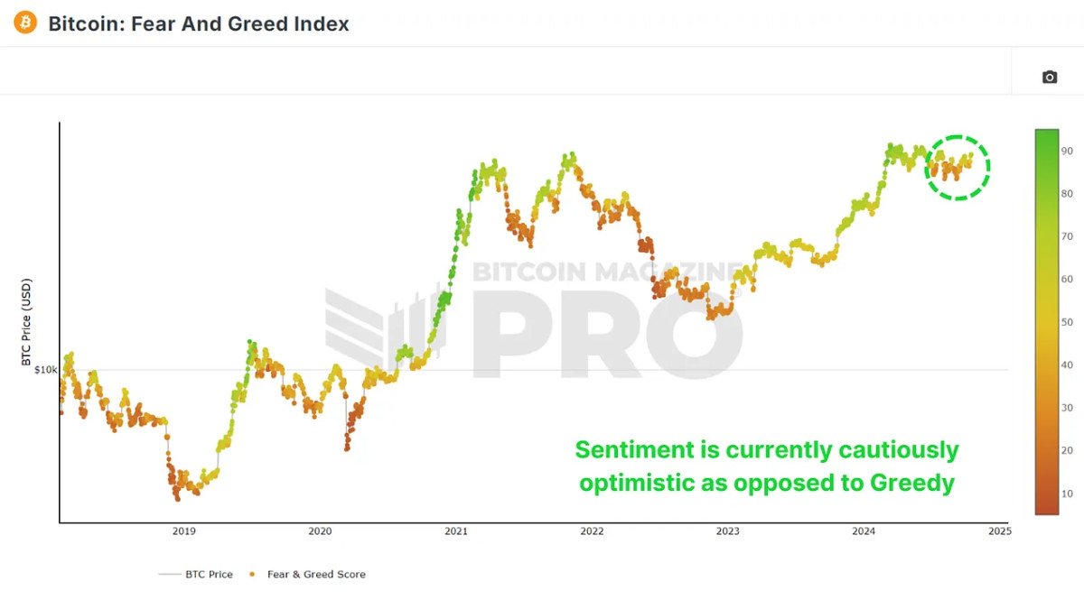The Fear and Greed Index is a useful tool for understanding market sentiment and how traders view the trajectory of Bitcoin. Currently, the index is at a “Greed” level of around 70, which is historically seen as a positive sign but still a fair distance from the extreme greed levels that could indicate a potential market top. This index measures emotions in the market, with lower levels indicating fear and higher levels suggesting greed. Typically, when the index surpasses the 90+ range, the market becomes overly bullish, raising concerns of overextension.
