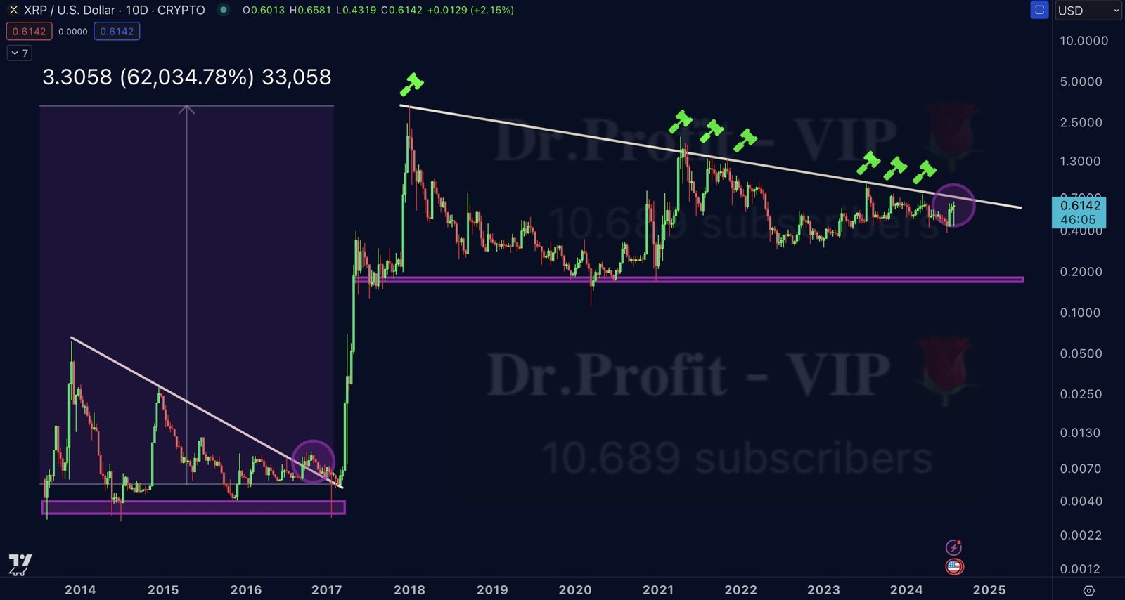 Focusing on technical analysis, Doctor Profit identified a crucial resistance line at $0.72, stemming from a pattern established back in 2017. This resistance has been tested multiple times over the years without a conclusive breakout. According to his analysis, the current chart formation is a mirror image of the pre-2017 surge setup, indicating a potential for a similar explosive price action if XRP can decisively break through this resistance level.