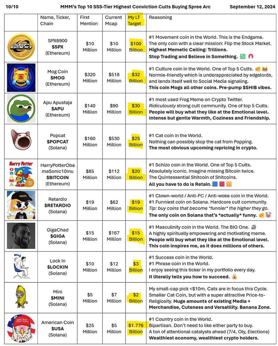 In a viral post on September 12, Mahmudov unveiled his top ten high-conviction memecoin investments, complete with ambitious long-term market capitalization targets. Among them were tokens like SPX6900 SSPX on Ethereum, which he believes could reach a $100 billion market cap, asserting it as the “number one movement coin in the world” with a mission to “flip the stock market.”
