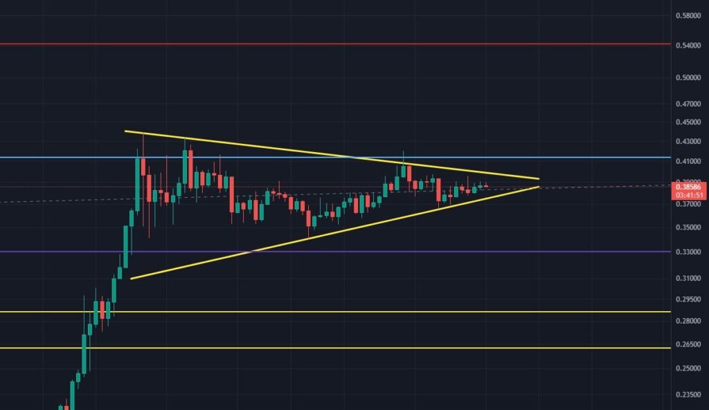 The chart also highlights several horizontal lines representing key support and resistance levels. The upper resistance is identified around $0.54, which could be tested if an upward breakout occurs. Conversely, immediate support levels are situated around $0.33 and $0.2950, which would be critical if the price breaks downward.
