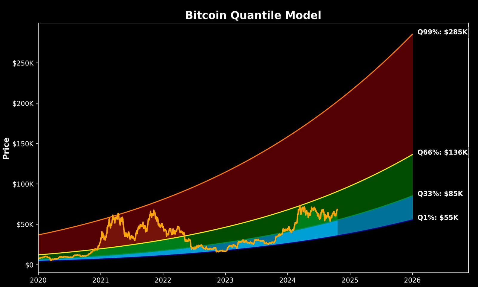 To contextualize the model’s predictive capabilities, PlanC elaborates on the significance of various quantiles. The 99.9% quantile means the price has been above this line only 0.1% of the time, equating to just one day out of every 1,000 days—a very rare event. The 99% quantile indicates the price has exceeded this line 1% of the time, or one day out of every 100 days, also considered rare. Conversely, the 0.1% quantile reflects that the price has fallen below this line only 0.1% of the time.