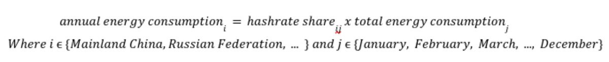 After about an hour or so of Troy Cross talking me off a rather impressive, art deco and weather-worn ledge that’s probably seen a few Great Gatsby flappers jump–a result of feeling an overwhelming sense of terror after my exasperated self realized that no amount of cognitive behavioral therapy would get me through this study–I determined the equation that the authors used to calculate the energy use shares for each of the top ten countries with the most share of hashrate (based on the IP address estimates) had to be the following: