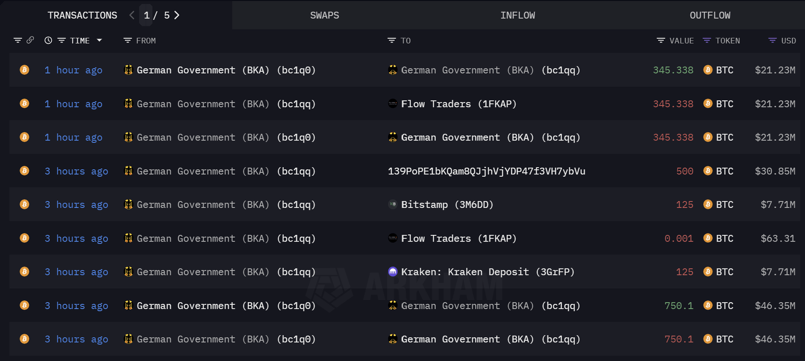 Arkham Intel’s data shows that four of them are internal transfers while five transactions were direct transfers to crypto exchanges and market makers, suggesting an intent to sell. The five potential sales amount to 1,095.339 BTC worth approximately $67 million. Specifically, the BKA made two 125 BTC transfers, each worth approximately $7.7 million, to well-known crypt exchanges Bitstamp and Kraken.