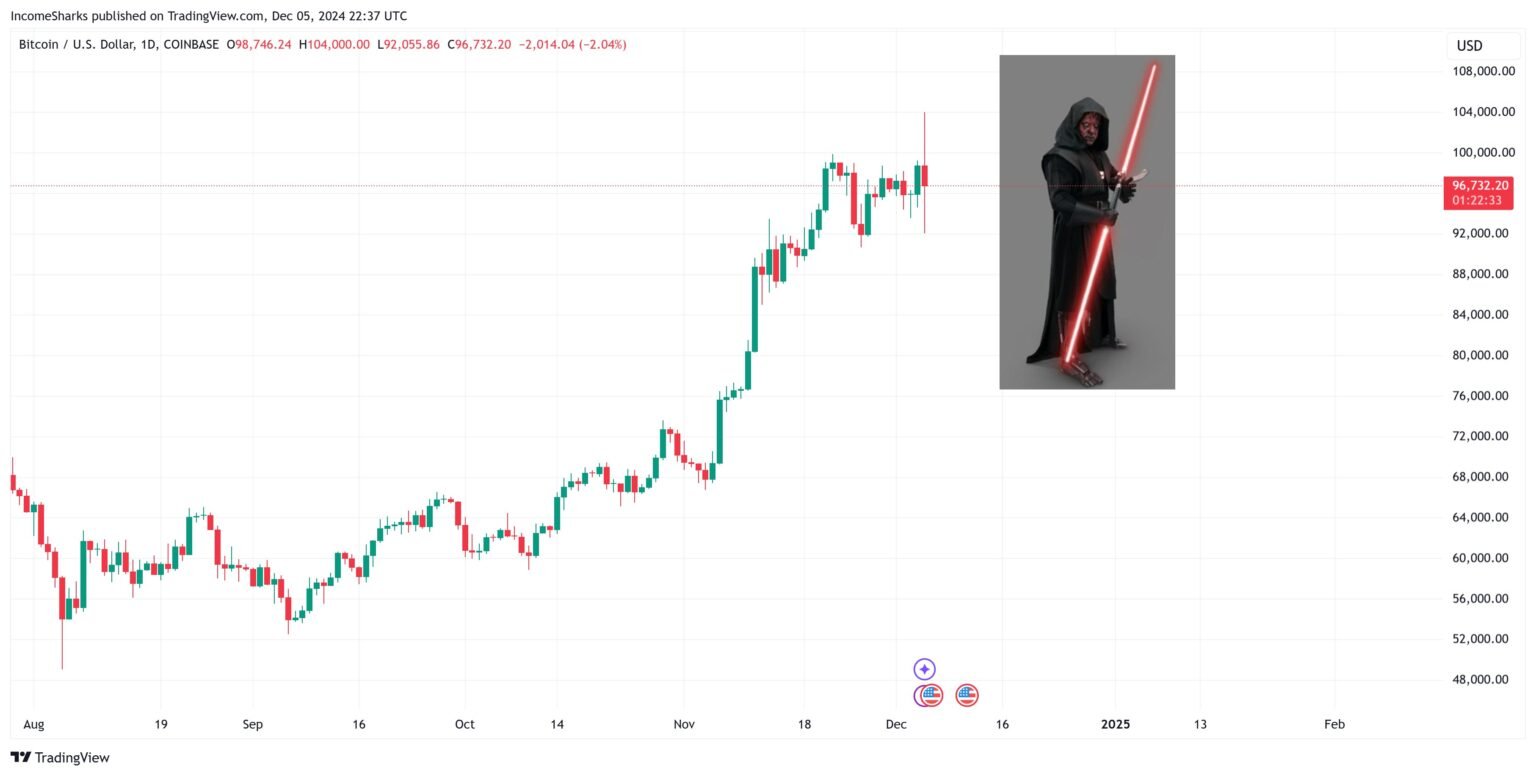 Bitcoin experienced extreme volatility yesterday after reaching a new all-time high of $104,088 on Wednesday. What followed was a textbook “Darth Maul” candle on the daily chart, as BTC plummeted from $103,550 to as low as $90,500 before stabilizing. While some observers initially read the move as a harsh rejection at the psychologically significant $100,000 level, leading analysts suggest this could represent a routine market flush-out rather than a cyclical peak.
