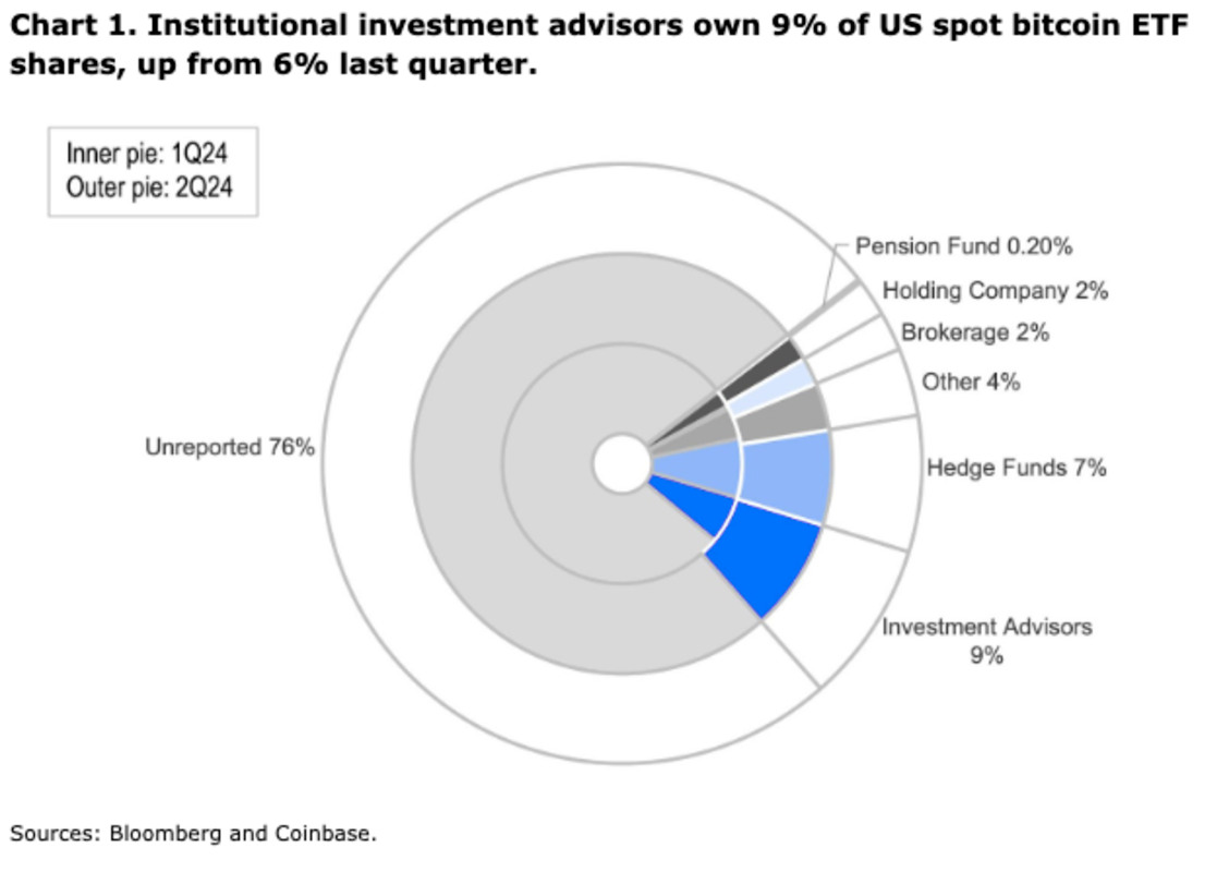 Coinbase has reported that updated 2Q 2024 13-F filings indicate a notable increase in institutional inflows into U.S. spot Bitcoin ETFs, which the company views as a “promising indicator” for the Bitcoin market. The 13-F filings, released on August 14, reveal that institutional ownership of these ETFs grew from 21.4% to 24.0% between Q1 and Q2 of 2024.