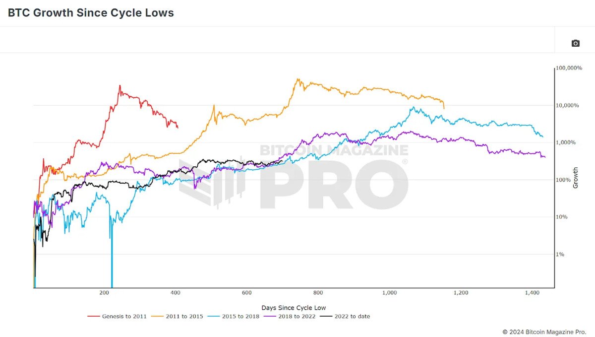 To begin, it’s crucial to look at how Bitcoin has performed since hitting its recent cycle low. As we examine the data, a clear picture begins to form: Bitcoin’s current price action (black line) is showing patterns similar to previous bull cycles. Although it has been a choppy consolidation period, where the price has been relatively stagnant, there are key similarities when we compare this cycle to those in 2015-2018 (purple line) and 2018-2022 (blue line).