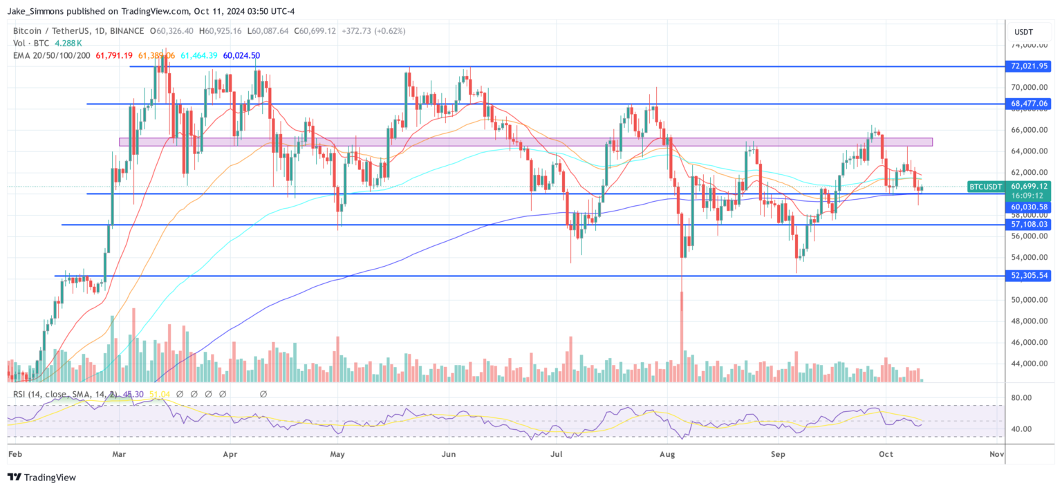 Loukas speculates that the market might “trend sideways into that period in November,” and that a significant move might not occur until after the election concludes. He suggests that “we still have around three to four weeks of some trending sideways action,” and he would be “highly surprised if this market can push into the $70,000s before the election here in the US.”