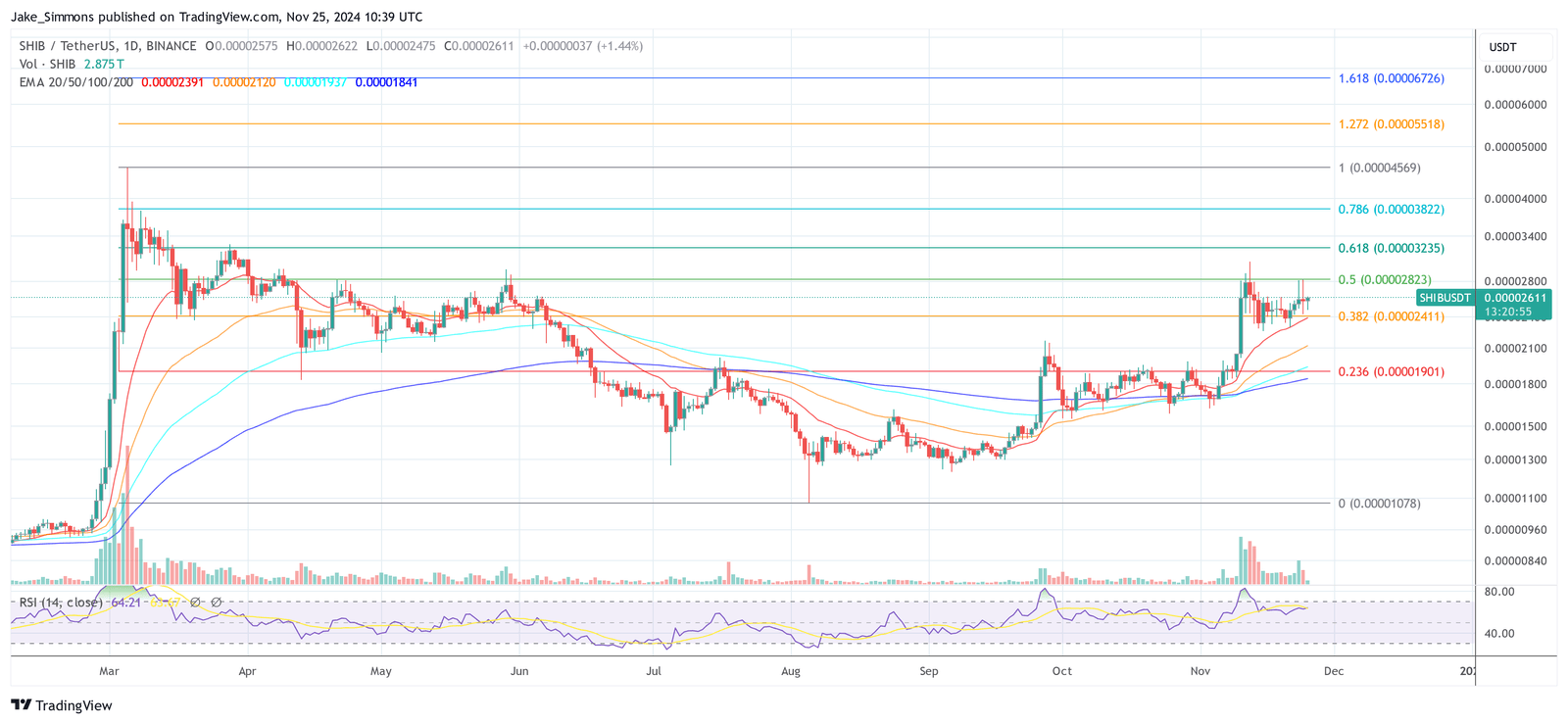 As of press time, SHIB is attempting to breach the 0.5 Fibonacci retracement level at $0.00002823. This technical level is derived from the March 5 high of $0.00004567 and the local low of $0.00001067 observed on August 5. In the short-term, a successful breakout above the 0.5 Fib level could pave the way toward the 0.618 Fib target at $0.00003235.