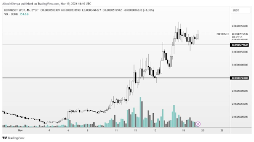 In an X post, crypto analyst Altcoin Sherpa said that BONK is loading for the next move. The analyst advised investors to just buy spot and be patient for the next leg up. The accompanying chart suggested that the Solana meme coin is set to blast through its ATH and reach new highs.