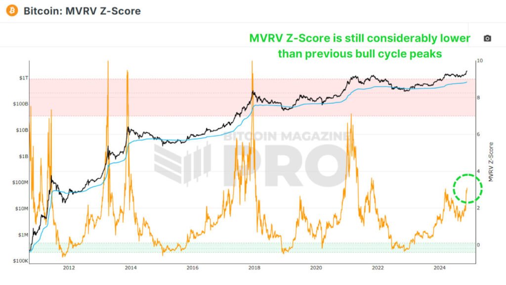 Currently, despite Bitcoin’s rise to new all-time highs, the Z-score remains in neutral territory. Previous bull runs saw Z-scores reach highs of 7 to 10, far beyond the current level of around 3. If history repeats, this indicates significant room for further price growth.