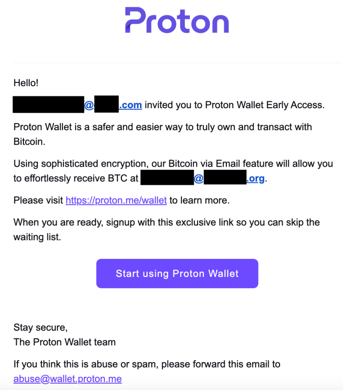 Once you’ve received an email invitation to use the wallet, you can click on the “Start using Proton Wallet” link in the invitation email to get started setting it up. (Email addresses have been blacked out below and throughout this review to preserve privacy.)