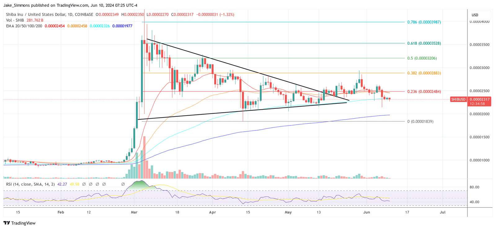 In the daily SHIB/USD chart, Shiba Inu’s price is currently in a consolidation phase, following a significant rally to this year’s high in early March. Despite breaking out of a symmetrical triangle pattern in mid-May, SHIB failed to sustain a close above the 0.382 Fibonacci retracement level of $0.00002883.
