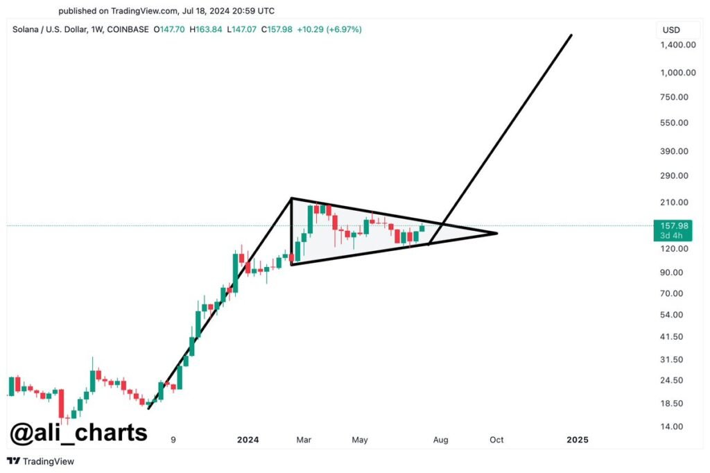 According to Martinez’ analysis, the price of Solana stands at $157.98 and thus just below the upper trendline of the channel. The consolidation has formed within a tight range, with the upper and lower boundaries clearly marked by trend lines converging towards a point on the chart projected to occur soon. The critical support level, as observed from the consolidation phase, is near the $130 mark, with the resistance level just slightly above the current price, around $160.