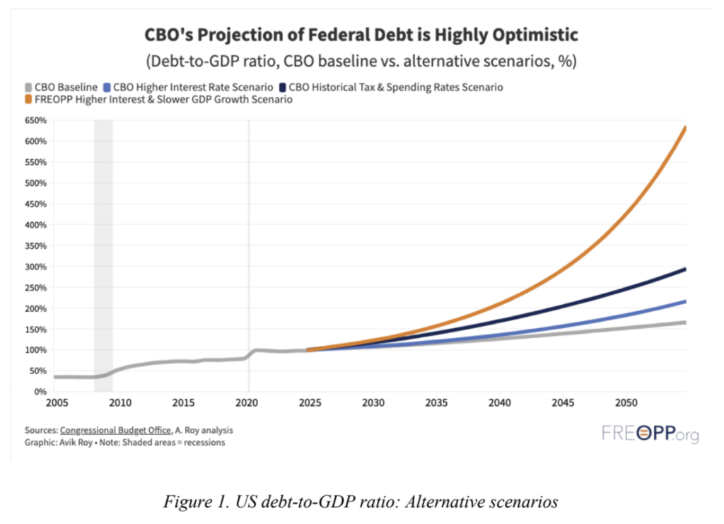 The CBO understands that its projections are optimistic. In May 2024, it published an analysis of how several alternative economic scenarios would affect the debt-to-GDP ratio. One, in which interest rates increase annually by a rate of 5 basis points (0.05 percent) higher than the CBO’s baseline, would result in 2044 debt of $93 trillion, or 156 percent of GDP. Another scenario, in which federal tax revenue and spending rates as a share of GDP continue at historical levels (for example, as a result of the continuation of purportedly temporary tax breaks and spending programs), yields a 2044 debt of $118 trillion, or 203 percent of GDP.[4]