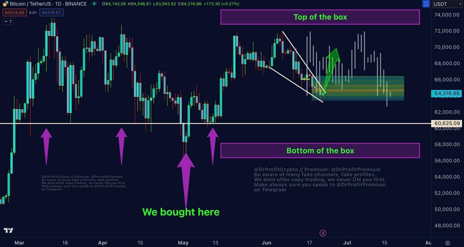 According to Doctor Profit, since the last big Sunday report, in which he identified a persistent sideways movement, nothing significant has changed for Bitcoin. However, a falling wedge pattern has surfaced on smaller and daily time frames, suggesting that $70,000 may be the next objective for the flagship crypto in the coming days.