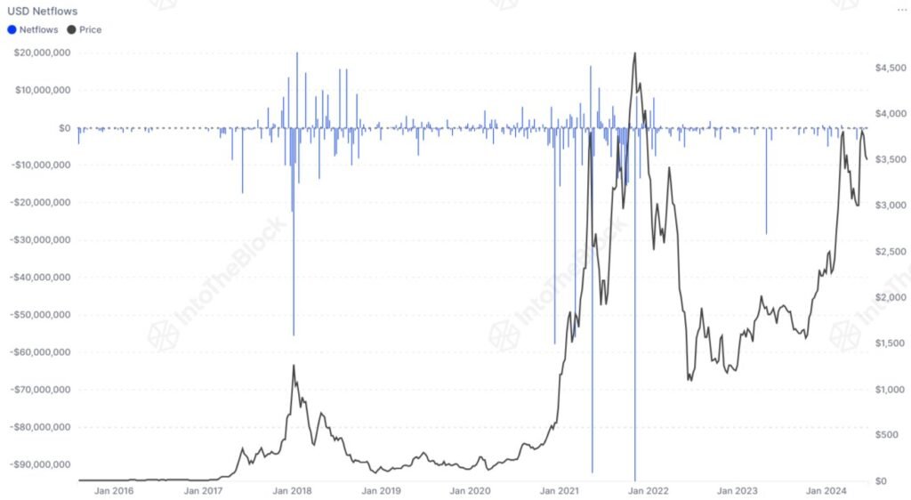 Below is the chart shared by the analytics firm that shows the trend in the net amount of ETH (in USD) moving in or out of the wallets connected to this organization.