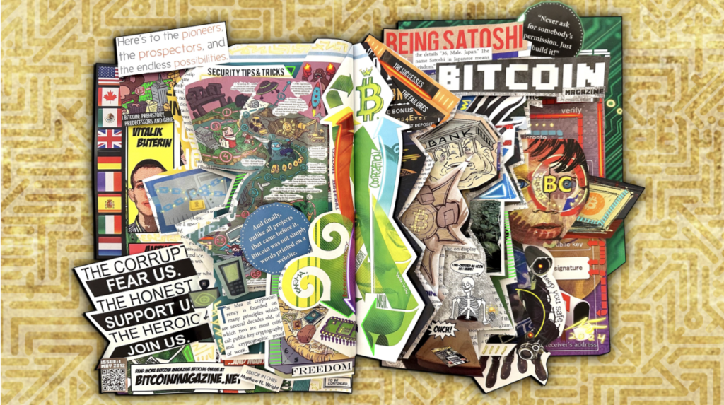 In a collaboration merging the worlds of art and Bitcoin, Marco Santini – an acclaimed impact artist – recently lent his creativity to Bitcoin Magazine and The Bitcoin Conference. His involvement began with creating a piece with Bitcoin Magazine’s very first issue, Illuminated: Bitcoin Magazine Issue #1 (see here), which was notably purchased by Emily Bailey at a Sotheby’s auction and now proudly resides in The Bitcoin Museum in Nashville, TN. This iconic piece features key elements that encapsulate Bitcoin’s pivotal moments in history from the magazine itself.