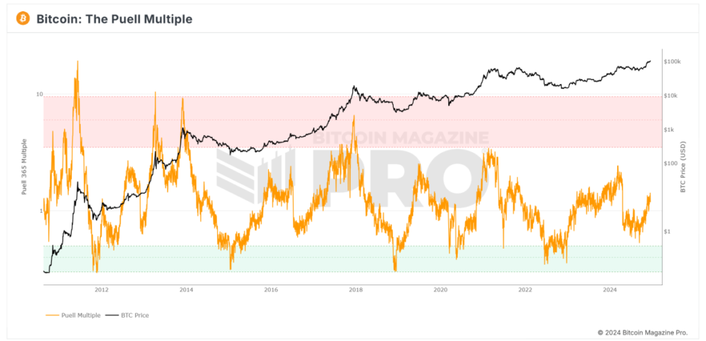 - When the Puell Multiple hovers between these levels, Bitcoin’s price is typically in a steady range relative to historical norms.
