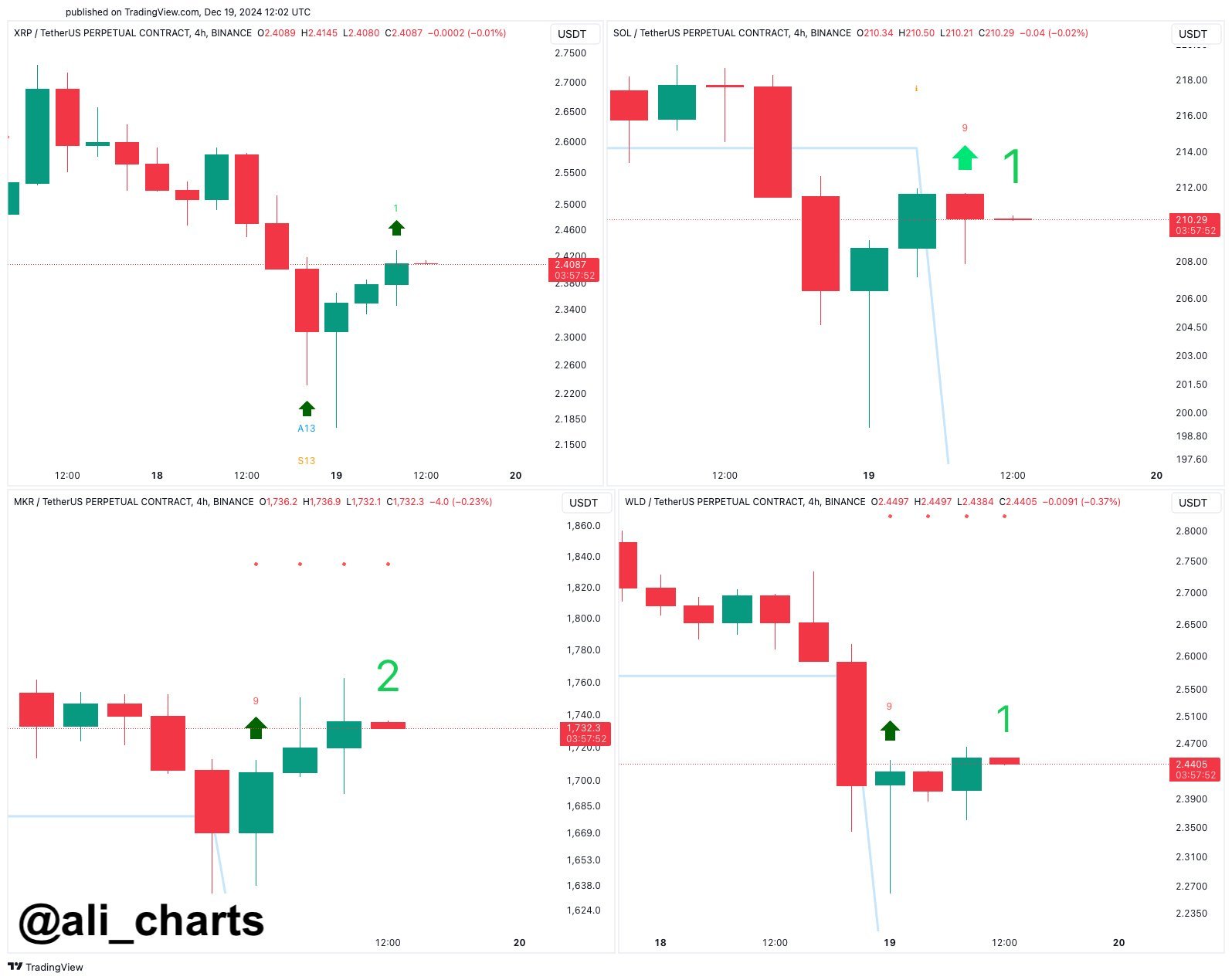 Now, here are the charts shared by Martinez that show the completion of the TD Sequential phase of the first type for four altcoins: XRP (XRP), Solana (SOL), Maker (MKR), and Worldcoin (WLD).